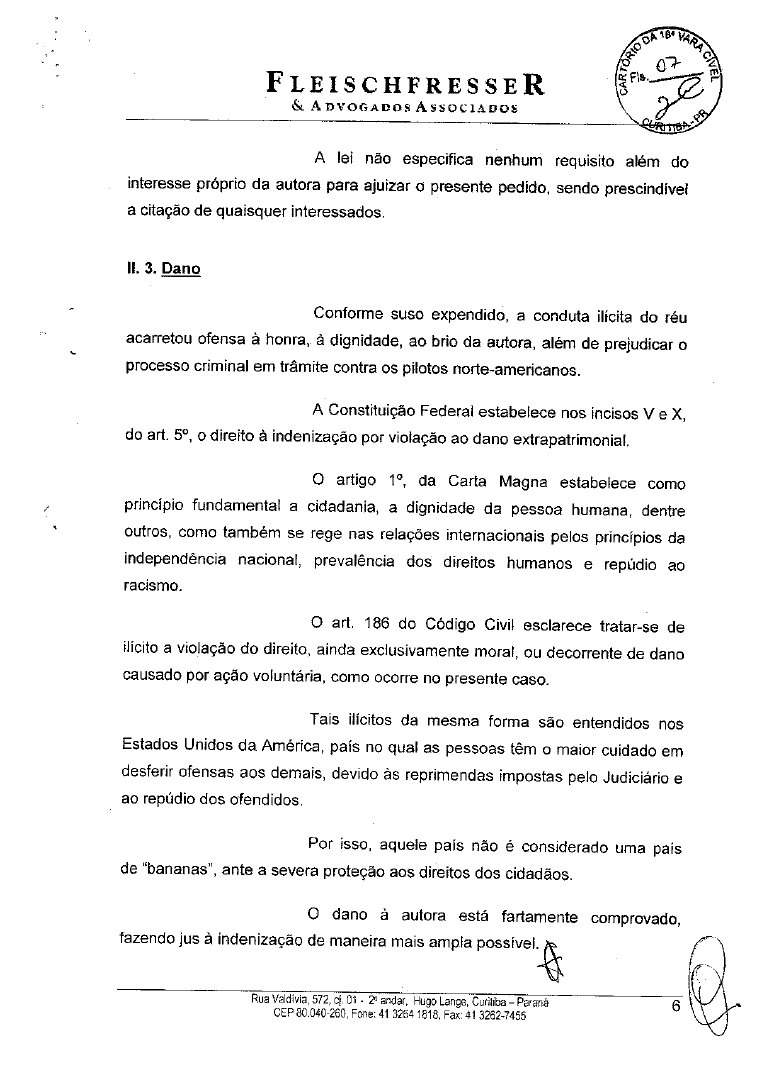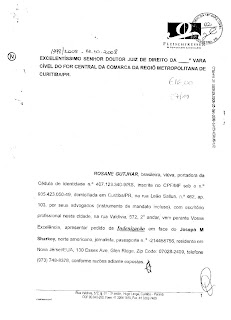 ROSANE GUTJHAR, Brazilian, widow, holder of Identity Card n.° 407.123.340-9/RS, with tax number CPF/MF 935.423.050-49, resident in Curitiba, Paraná, at Rual Leão Sallum, n.° 462, apt. 103, through her lawyers (power of attorney included), with their professional office in this city, at Rua Valdívia, 572, 2° floor, comes before Your Excellency, presenting a request for Indemnification against Joseph M. Sharkey, North American, journalist, passport n.° -214458756, resident at New Jersey, USA, 130 Essex Ave, Glen Ridge, Zip Code: 07028-2409, telephone (973) 748-8378 for the reasons set forth below.